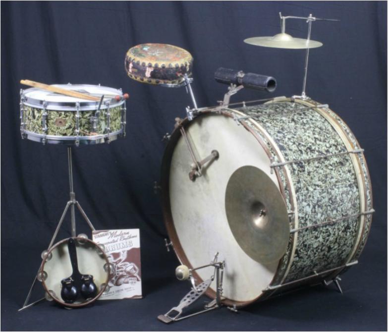 I'm looking for info regarding what was often called the "bass drum cymbal attachment" on early drumsets. A cymbal mounted vertically on the front of the bass drum, struck by a metal beater that attached to the beater shaft of the bass drum pedal. It was notated by adding the word "together" next to the bass drum notes, often abbreviated to "tog," indicating that the bass drum and cymbal should be struck together. The old drumset photo below shows a typical cym attachment. (Not talking about low boy or sock cym)