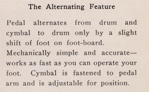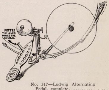 It seems that this problem was solved with the addition of the "alternator" to the pedal. Based on the images below, alternator was a term used to describe any device that improved the drummer's ability to move the cymbal attachment into playing position. There are images of a lever that pulled the cymbal out to place it within range of the beater. Also, the pedal below labeled "Alternating Model Super-Speed Pedal" seems to have a different system that I don't fully understand.