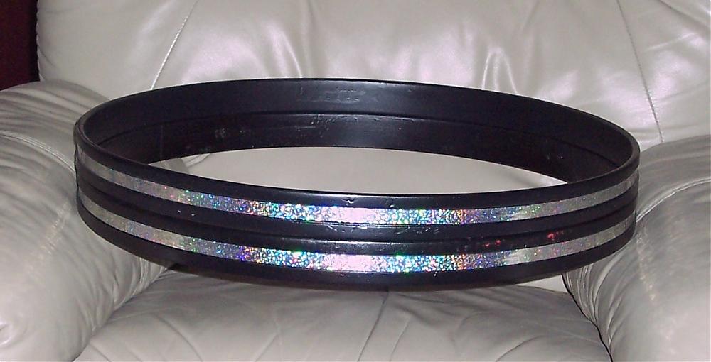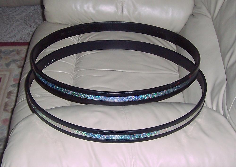 I've got a pair of 20" bass drum hoops that were mounted on an early 60s Rogers Holiday BD. From what I was told by the prior owner, one of the hoops was original to the drum while the other wasn't. One of the hoops (the original?) measures 1 1/2" wide while the other is just slightly less. Both hoops have 1/2" in-lays. The silver sparkle material you see in the in-lays is glitter tape. I'd like to get $50 for the pair + shipping. If interested please drop me a PM. Thanks!