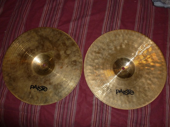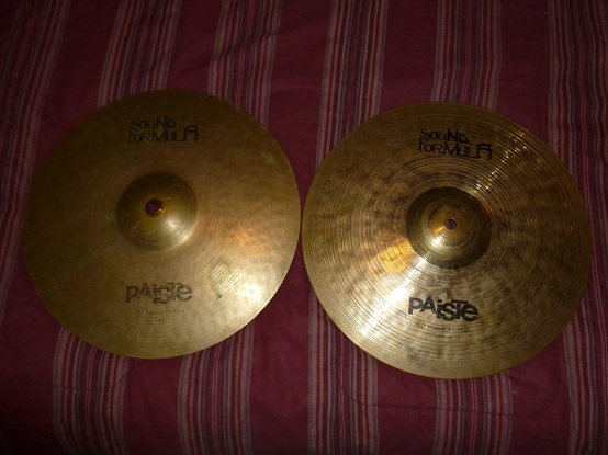 This is a very nice pair of Paiste 14" Sound Formula heavy hi-hats, no cracks or keyholing, thanks.