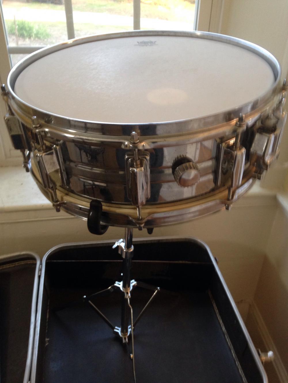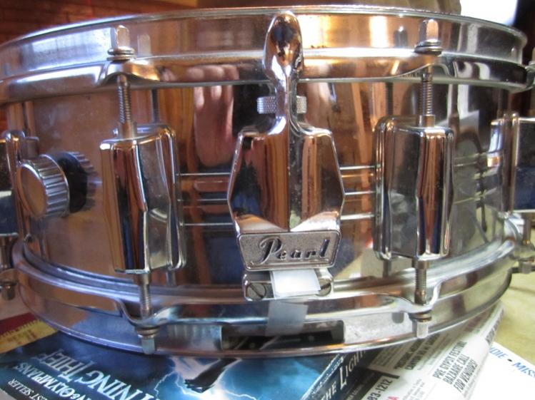 Just picked up this 10-lug student set up from the guy's mom in Concord,NH. Steel shell, stand, Remo drum pad, all the music books from Ted Hebert's in Manchester and the Pearl-branded key in its little bag and the case. Looks to be from 70-75 era. Some minor pitting but the end of the strainer is NOT broken off. Original snare-side head. Cool...