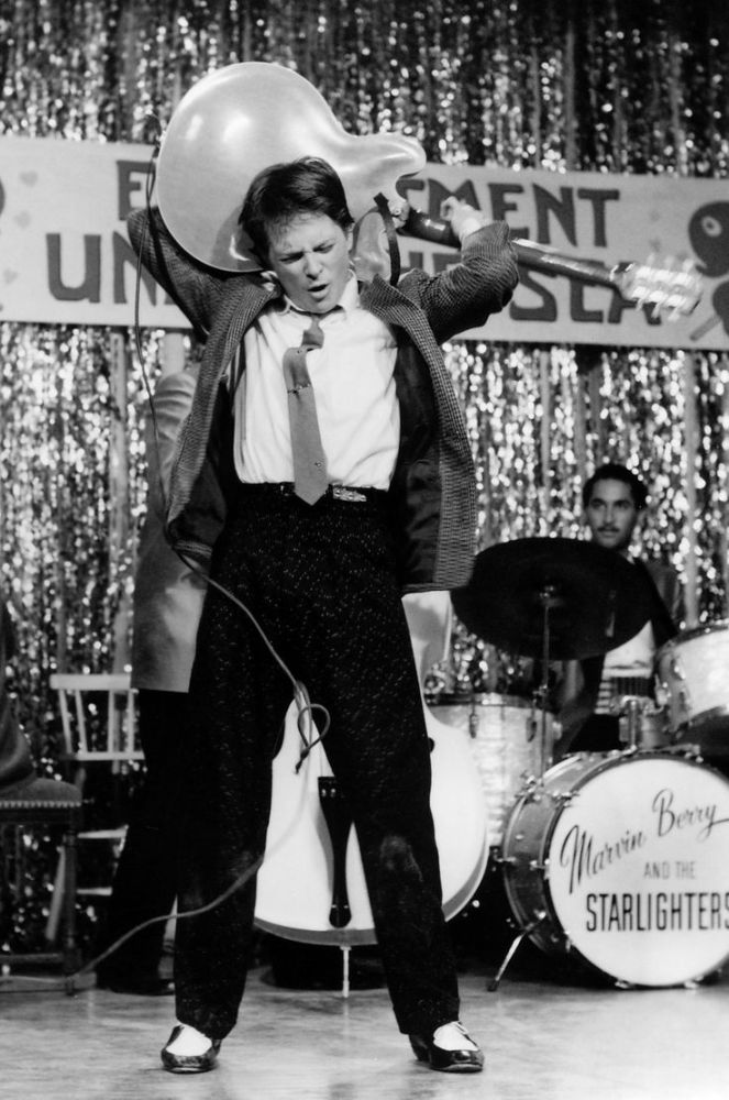 Not only are the drums not period correct in Back to the Future, but the guitar Marty McFly is playing isn't correct either. Humbucker pickups didn't come out until late 1956.