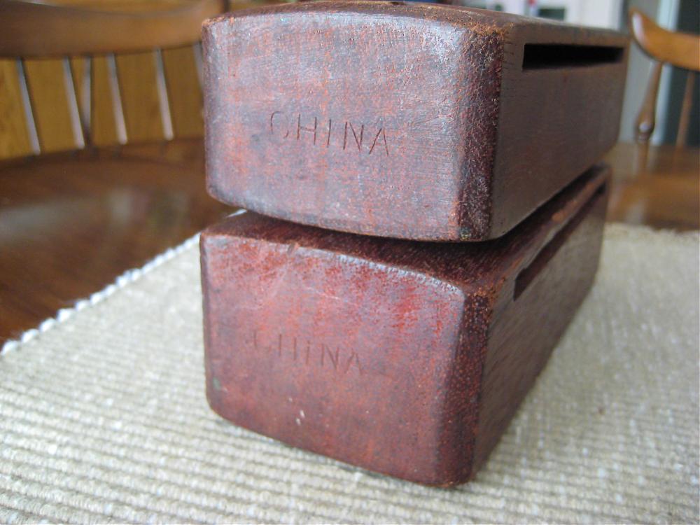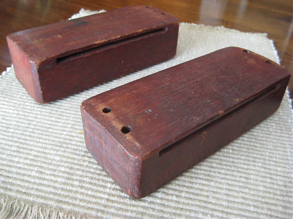 I got these wood blocks with a Leedy Tom Tom and a Duplex snare. I figure the drums are from the 20's to 40's. So I'm assuming these wood blocks are from the same time frame. You can see the word 'CHINA' stamped on the end of each block. The blocks aren't identical. One is very slightly larger than the other and one has two holes at each end (for mounting I would assume) and the other has only one set of holes. There are no other markings and no sure sign of a sticker being removed. To me they look just like the Leedy wood blocks in the old 30's catalogue, but the CHINA thing throws me off because the Leedy factory was in Indiana and the Duplex factory was in St. Louis. Can anyone shed some light on who made these wood blocks, if maybe Leedy or Ludwig imported them, and from what era they are? Also, I was thinking about cleaning these up a little with Lizard Spit Fred Board Conditioner. Probably a dumb idea—but before I did—I thought I'd see what you guys think.
