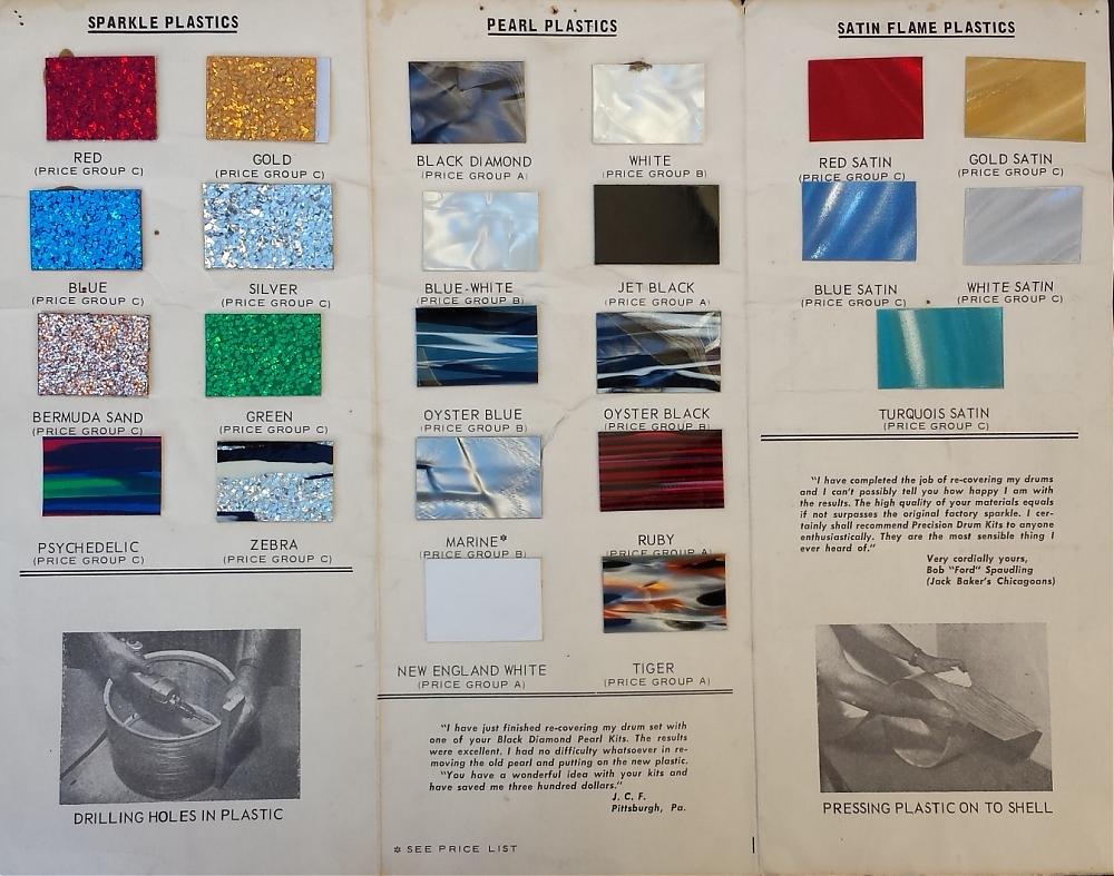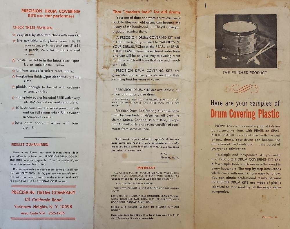 I have a tri-fold that i would like to contribute being a newer member . It shows drum wraps that were available for recovering & other info. Just wanted some kind of permission to post a pic or send it to some one in charge to do so on my behalf. I believe it came with my first purchase from them in the mid 70's . A first father son project as a young teen.