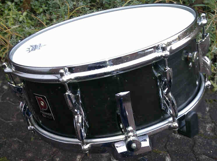This is the latest addition to my '303 Outfit" in grey shimmer, the respective wooden snare drum matching the same finish: a Premier '2001' snare drum in 14" x 5.5". Genuine hoops, slotted tension rods, damper and 'Premier' 24 strands snares.