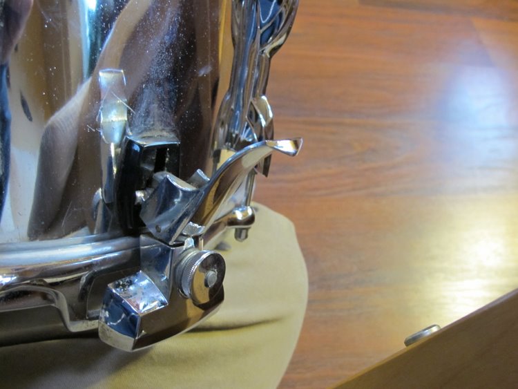 There's a series of holes on opposite sides of the drum, 90 degrees off from the badge. You can see one set of them in the last photo. I can't tell what these are for -- the drum already has a tone control in a different hole, so I'm stumped.
