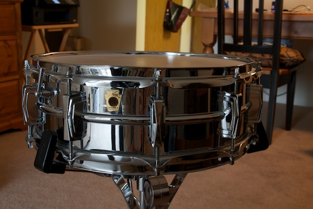 The hoops were restored by Ayotte, the rail and hardware were obtained on eBay and other sources, I think the kit looks pretty good. BUT I do not like the Club Date kick drum.