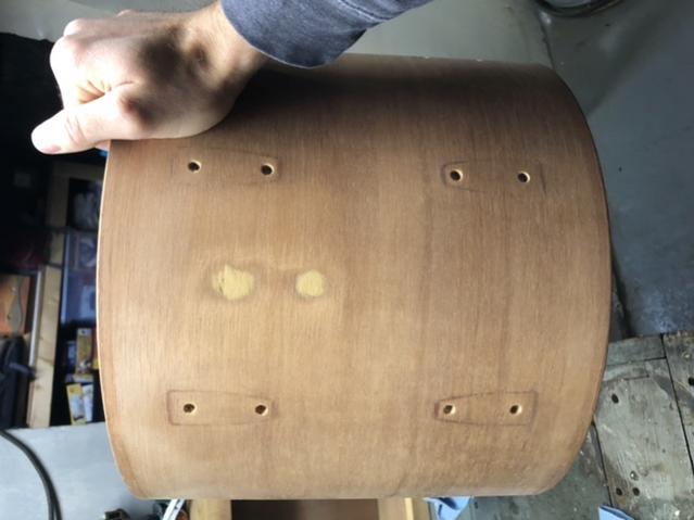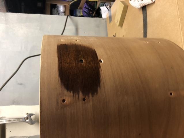 See pics below. One is a test patch of stain over a small area I had to use putty on. This area will be mostly covered with a lug, so I’m not worried. The other is the picture of holes I filled in the rack Tom that I’ll probably re-do. Give me your suggestions and share some pictures of your staining jobs!