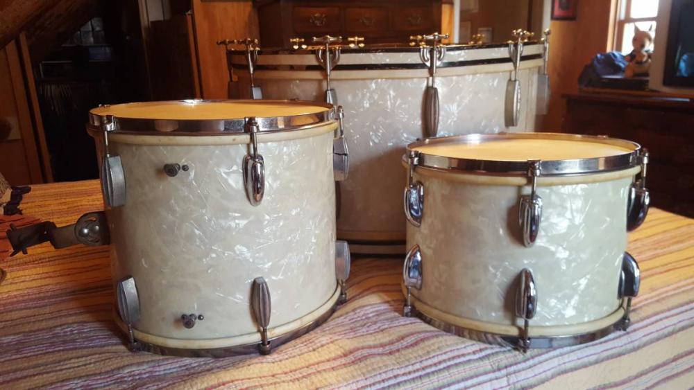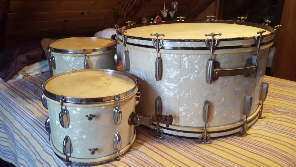 Someone local is selling these Radio Kings (9x13, 12x14, 16x28) and claiming they've been in the family since the 1930's. Original calfskin heads, no apparent extra holes or modifications, cloud badge on the bass drum only.