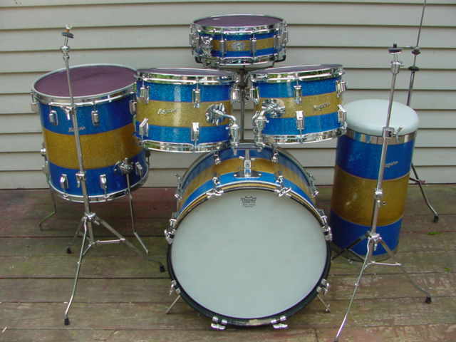 NOT my eBay listing so I didn't post this in the "For Sale" section. Just thought this would be interesting to the other Rogers guys. Rare two-pearl custom order with matching Dyna and throne! Even though the Dyna tag looks pretty beat up like it's been removed, the finish does indeed look like an original custom wrap (with expected shrinkage at the seams). Price is a little rich for my blood, otherwise I'd go and check these out in person as they're only 45 minutes away. I'd like to see the Holiday labels on these. Shells and collets look Dayton, but the star washers and white-pad mufflers scream Fullerton. Just thought I'd share this interesting set.