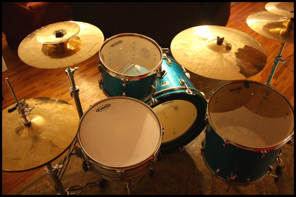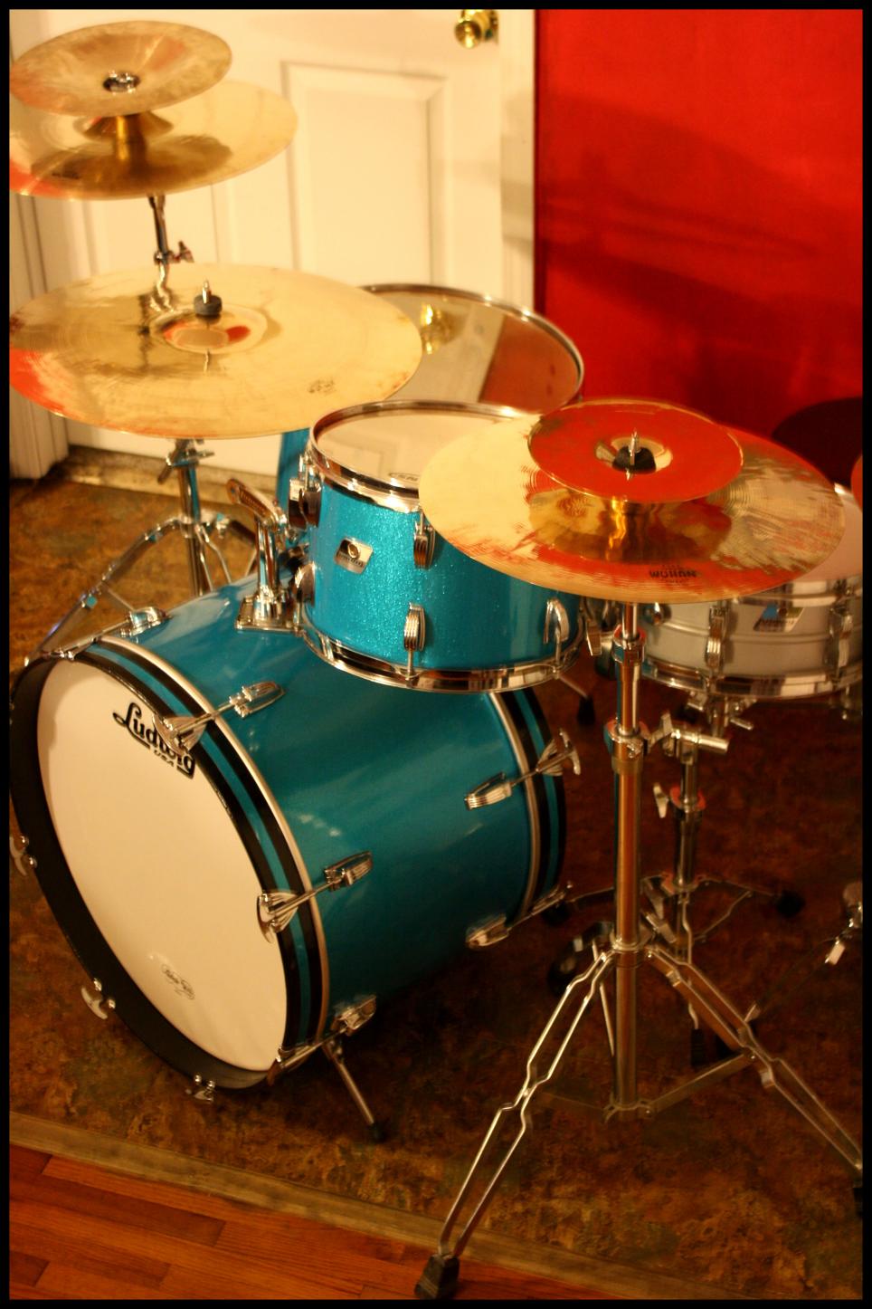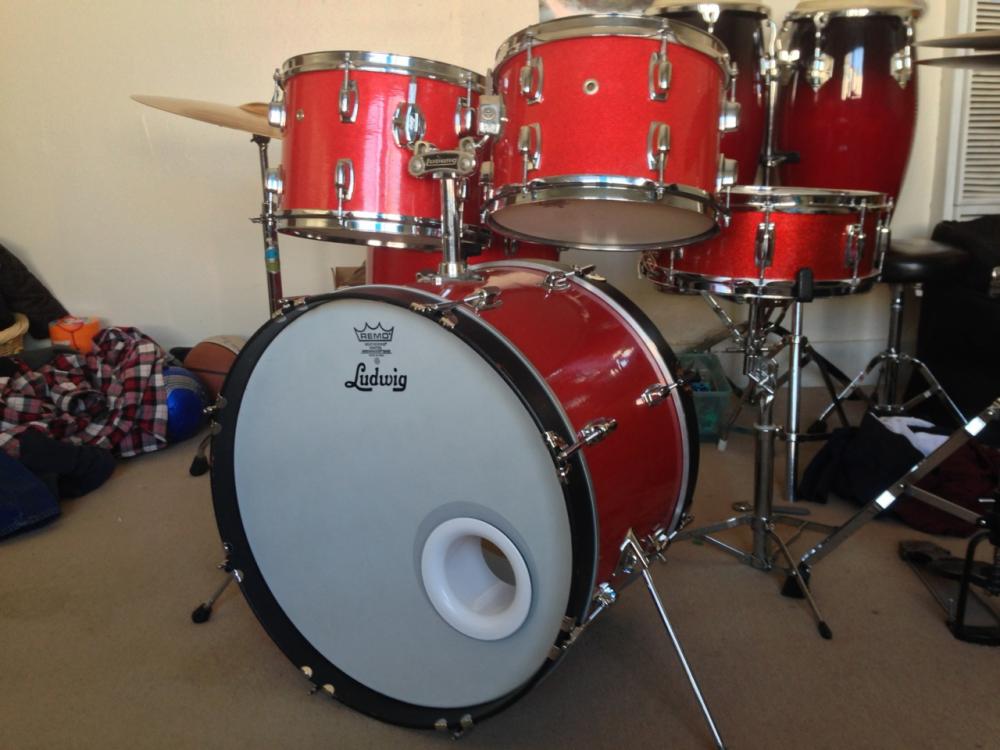 Great job, and they look fantastic. I used the same stuff, in red sparkle, for rewrapping my Rocker II kit a couple years ago. I didn't have the badges to reinstall. The wrap is clearly not the same as Delmar, but it was easy and worked well for me. The sparkle is better than my camera can capture, and I've done 50-60 gigs with these with no issues. The snare, BTW, is an original wrap Ludwig Standard that I picked up later on.