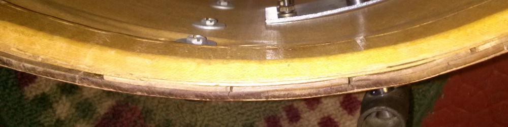 3. Once the voids are filled and dry, put a little Carpenters glue on a toothpick, or a brush and coat the gap between the plies. Do not use a lot of glue, or over-tighten the clamp. Use just enough pressure to re-adhere the ply. You can cut a 3 inch section out of an old unused bass drum hoop and use it a shim between the clamp and the drum.