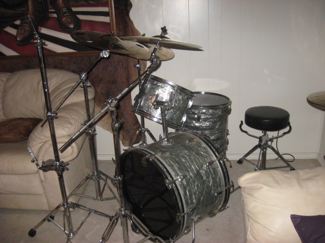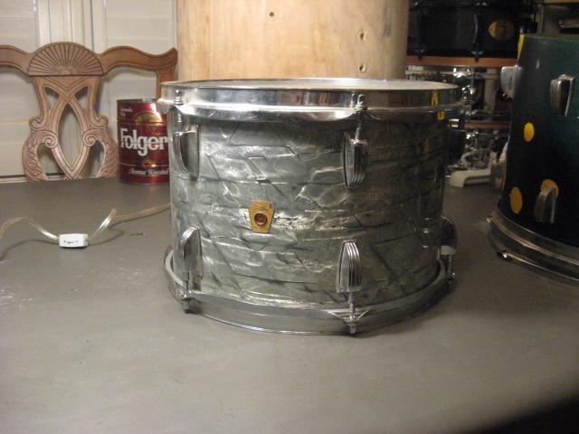 My dearly departed friend, Cliff Dillard, had this ludwig kit. He always claimed it was origanally Ringo's drums. lol He died a few yrs ago and left the ringo drums to his son. Eventually, I bought the drums from the son. They have been in my closet, along with my sonor teardrops, my brother gave me, for a number of years. My g/f suggested I set one up in the livin room, sooooooooooooooo, I just finished restoring my early 60's teardrop Sonors and finished my 1960 Student Radio King snare, and am waiting on parts for my 66 luddy marching snare and olive badge acrolite, as well as my 60's sonor cymbal stand. sooooooooooo, here goes! I am going to use this thread to document the restoration of my 2nd full kit restoration, 1st up is my 12" tom tom