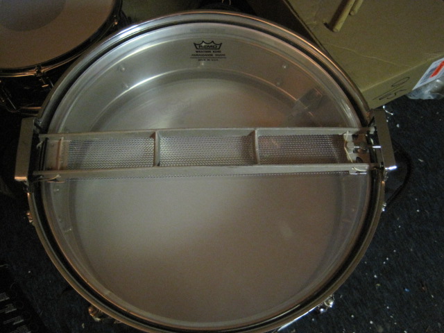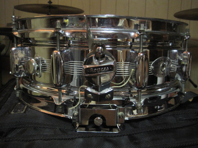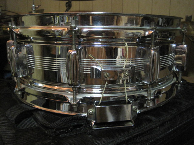 Selling this Dynasonic to fund other projects. Thought I'd give it a shot here before hitting Ebay. Pics are pretty self explanatory. Just a beautiful drum with not much wear for its age. I'd conservatively say it's a strong 8.5 out of 10. A few light scratches and just a tiny bit of rust on the hoops. No chrome loss on the shell. No dents or dings. All original except heads, snares, and snare chords. Original first gen. frame with original black elastics. NO CRACKED LUGS, however, 3 of them are Petty's. $700 shipped anywhere in the lower 48, or may be willing to trade for Ludwig stuff.