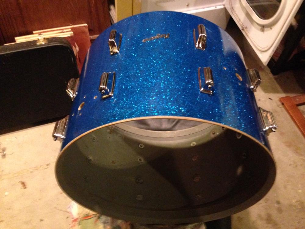 I have been slowly putting together a Rogers Holiday blue glitter kit from various orphans. The mounted tom and floor tom were picked up separately, all hardware removed and cleaned and the shells rewrapped; I'm happy with the results and they sound great. Then a couple of weeks ago I got the following bass drum shell from Ebay for $50 (plus $50 shipping... a little high but whatever). Here's the item #: