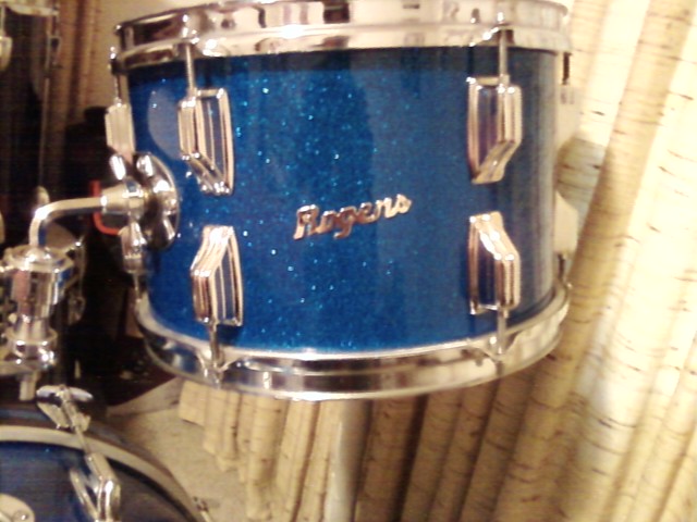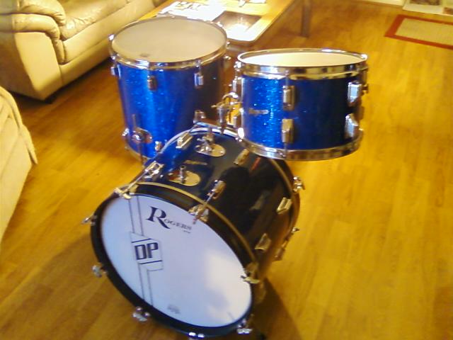 The kit is a stunning blue glass glitter, 16,20 are Cleveland era, the 12 is Fulleton. They all have flat grey interiors with badges. All bearing edges are good and wrap is tight. No extra holes. Original swivelmatic double tom holder, both tom mufflers are present. The kit is very clean.