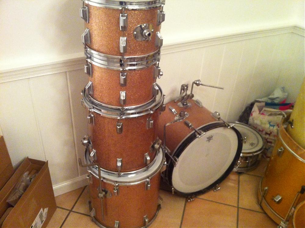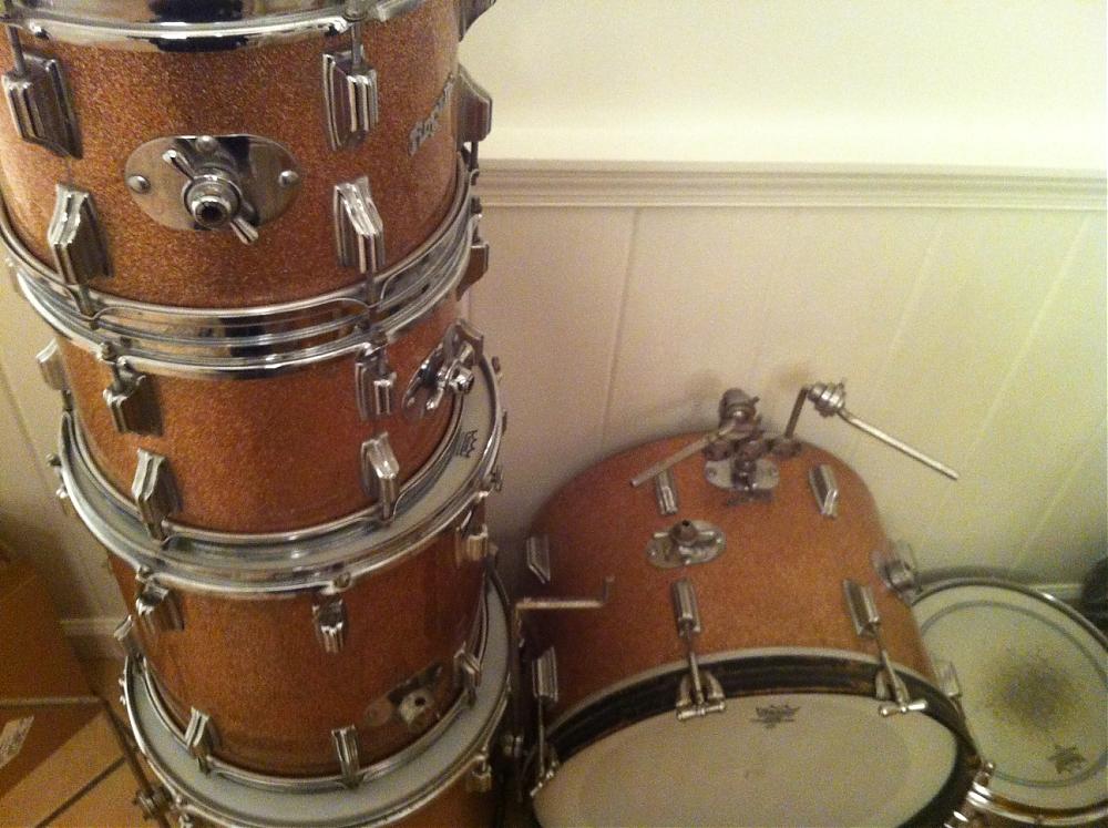 Rogers Cleveland era Champagne Sparkle kit. I believe the kit came as a 3 piece (12, 14, 20) and the other drums were added. I am willing to sell the 3 piece by itself, the added toms separately or everything together.