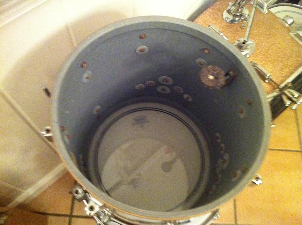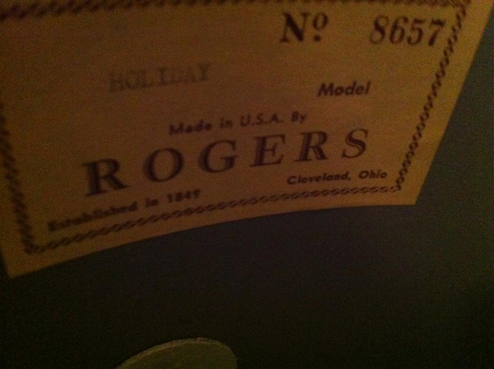 Cleveland Holiday tag. Edges and interior are nice, although bottom edge has a few very small dents/scuff marks. Slope of the bottom edge also has some superficial scuffs in the paint but does not affect area where drum head touches the drum. Interior paint has two longer superficial scratches as well as some other very light smaller scuffs/scratches. Bottom re-ring has very slight separation at ply seam (probably from factory). Wrap has some fade visible at edges. There are some tape residue spots on the wrap as well as some very light/small paint drip/splatter spots. These can easily be taken off. There is one scratch in the wrap that is about 2" long and is only visible at certain angles, although hardly. Lugs have some very light pitting and scratches. Collets have some light pitting and light rust specks. Muffler pad is somewhat smooshed. One hoop is not original and is marked "Made in Taiwan". This hoop has some light rust spots and the corresponding tension rods do not appear to be original. Other hoop has some light pitting and light rust spots. The drum is missing two tension rods and one of the legs is not original (Slingerland I believe). All legs are missing their rubber feet. Some pitting and light rust spots on the two original Rogers legs.