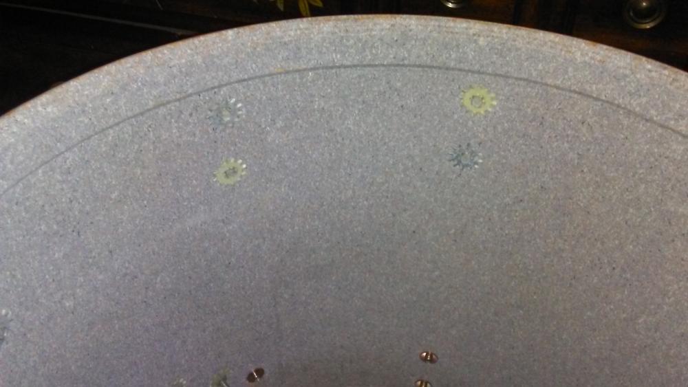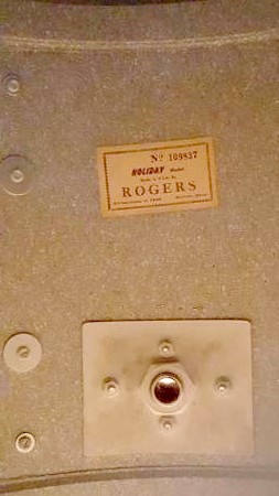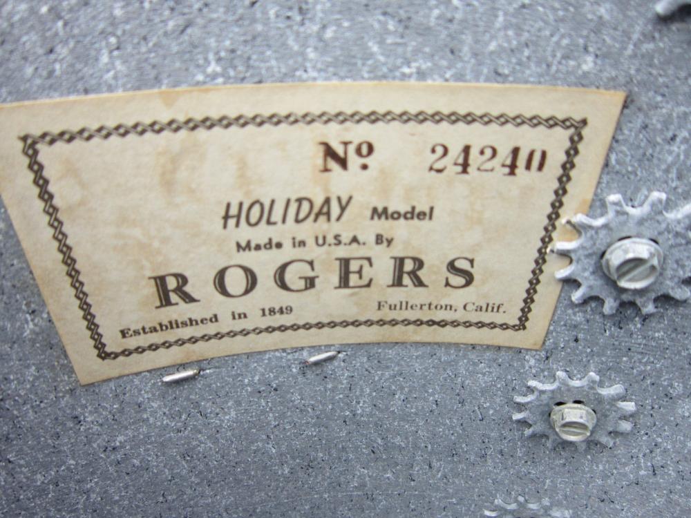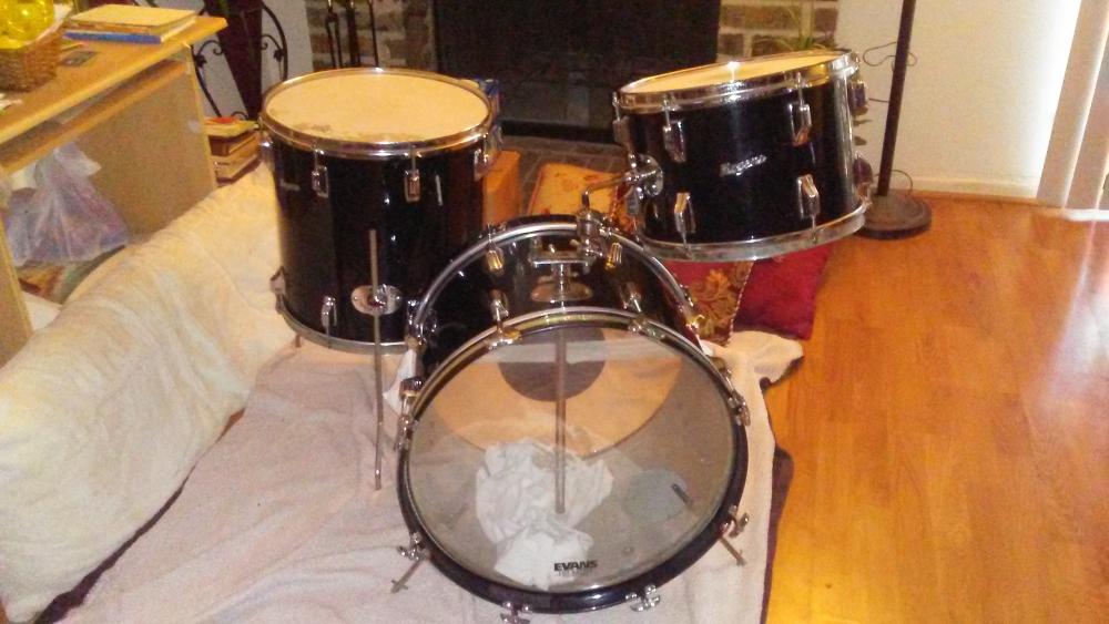 I got this kit as part of a trade deal, it was missing all bottom lugs on floor, kick and missing one on tom. There were no bottom hoops, t-rods or claws. I got all but one lug from Vintagedrumbug, (Thanks Vinnie), I had the hoops for toms and bought t-rods and claws here locally. I was still missing a kick hoop so I went to Sam Ash. My bud there says follow me and took me to his car, opened the trunk and there was at least 15 wood hoops. He said he was using them for some art project, I found a black 20" hoop and he charged me 20 bucks. So here it is, a Fullerton era Rogers ready to rock&roll again. Now I just need a coated kick head with a Rogers logo.