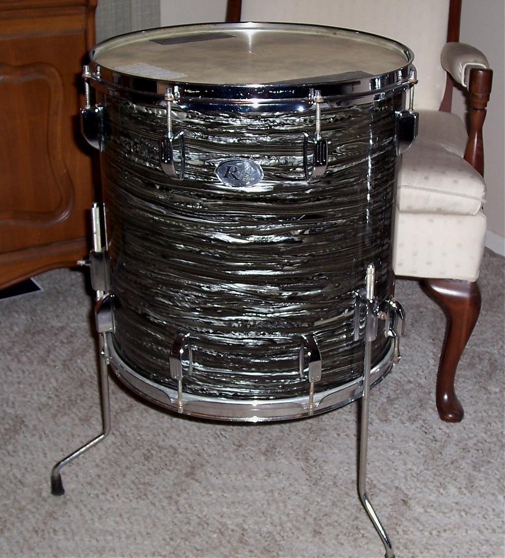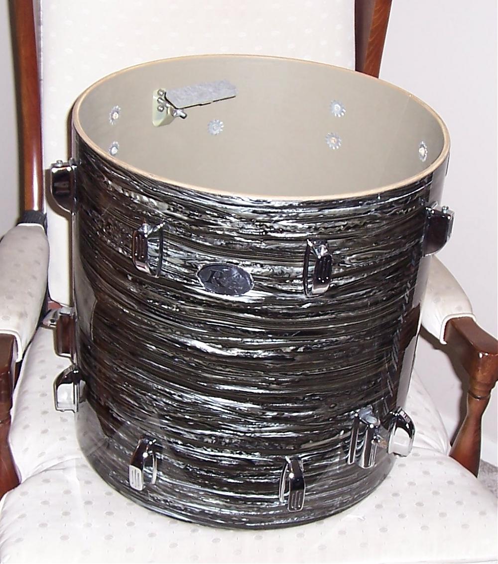 I'm going to be moving this 16x16 floor tom and would prefer to avoid e-Bay, if at all possible. I'm honestly clueless as to the value since I haven't found any other '60s R-360 floor toms in a Black Oyster wrap. If anyone can enlighten me in regard to a "reasonable price" for this drum I'd be very grateful. The wrap and hardware are in extremely clean condition. The drum, howver, will need new heads. One of the three FT legs doesn't match the others. As far as I can tell everything's original other than the aforementioned floor tom leg. I have no idea what the stamp on the interior shell indicates. Again, if you happen to know, I'd appreciate any "words of wisdom".