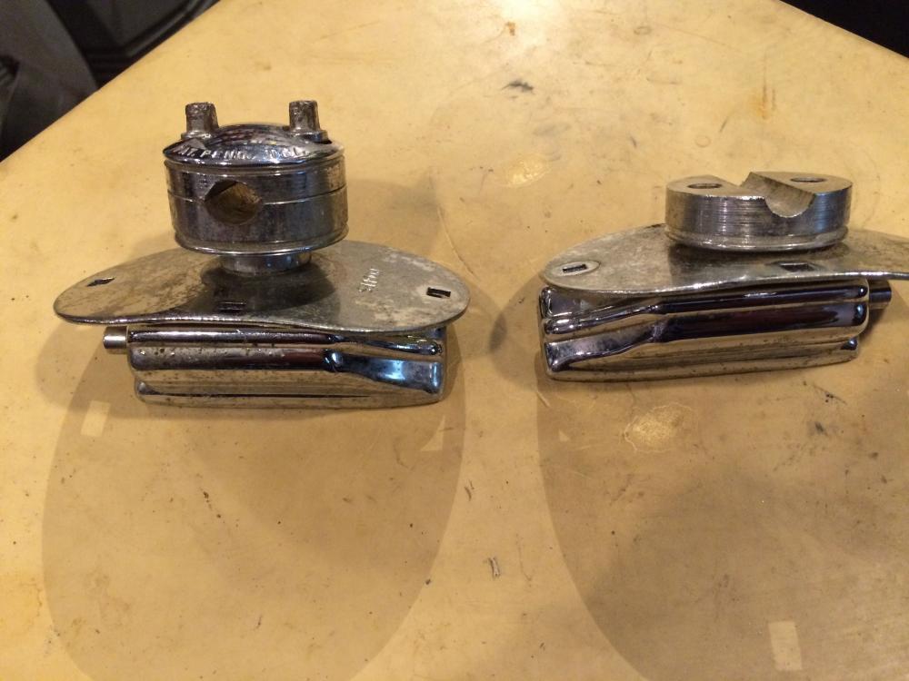 These are what came with the drum I purchased. The complete knobby on the left came off the floor tom. All 3 are the same. The partial knobby came on the bass drum. Swivo-matic hardware,when introduced, came with hex only is what I gather.There were round legs in the 50s I believe,maybe early 60s. There was a pair on ebay yesterday. When I removed these knobbys off the floor tom,I could seethat they were never removed before. The star washer marks are original. Meaning only one dent per star,if ya get what I mean. Anybody want to guess whats going on? Hex legs fit but again the knobby is round on both sides.