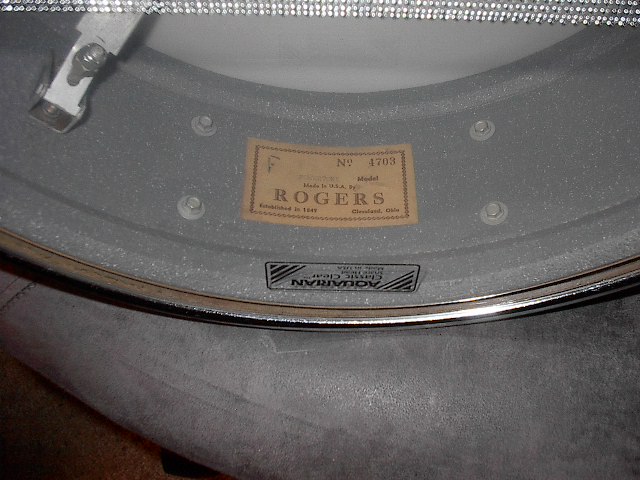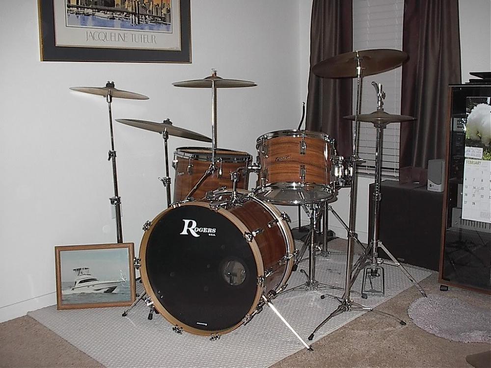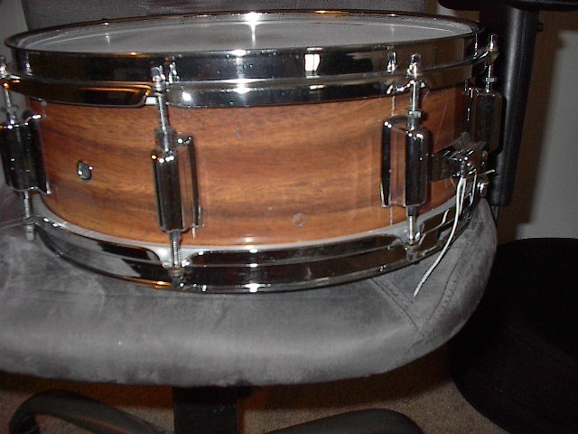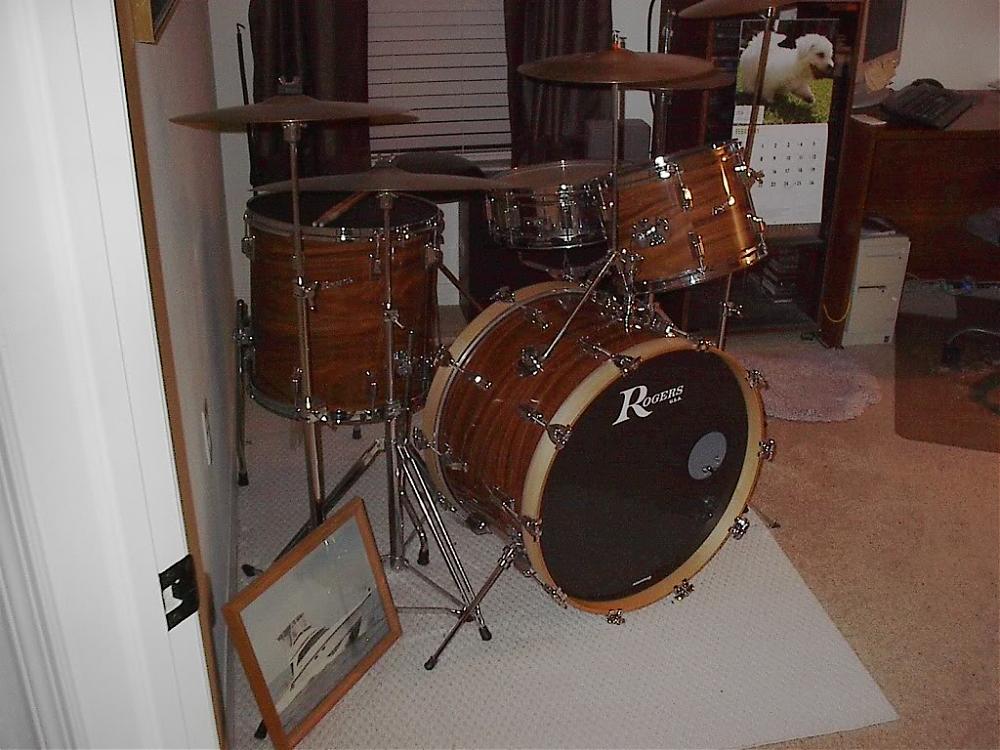 Also there is a matching maple 5x14 Powertone snare. The snare is not original: it is a genuine Rogers snare shell, but it is wrapped with genuine Koa wrap salvaged from a damaged tom. It has a few patched holes in the wrap, but it looks very good and sounds great.