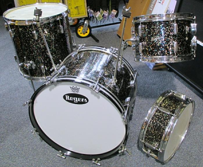 For those of you that are inclined to the B&B era Rogers drums and have interest in obtaining one of the very rare Rogers finishes on a set, being Mardi Gras, Portland Percussion (Portland, ME) has this one on their website for about $2500. The snare drum is from a differing era, but I suppose it is possible they would allow you to purchase just the three matching era drums for an adjusted price. The ideal set-up would make use of a snare drum from the same era with the Swivomatic mount in it and the dog-leg arm so everything was mounted to the bass drum. That's the way they mostly promoted the use of their hardware in that day.