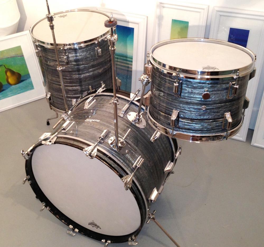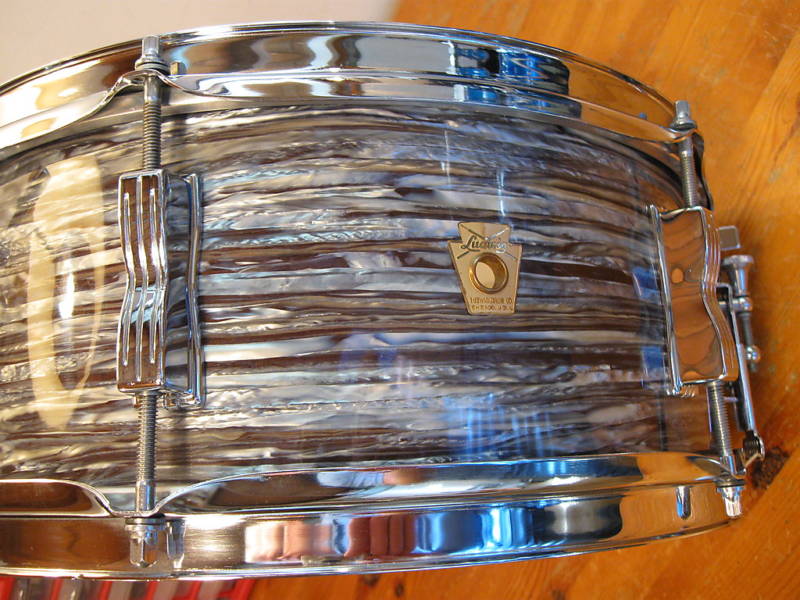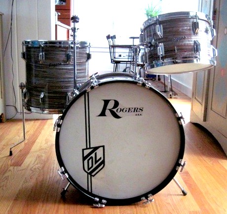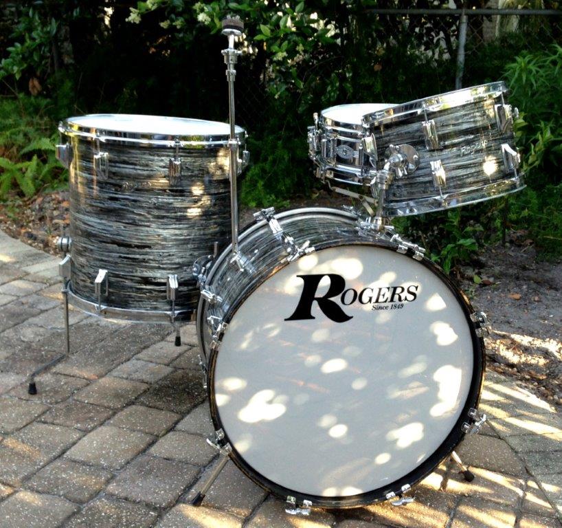 I do note that the strata used in the 60's was a differing pattern than what was used by Ludwig, as Mark also mentioned, though I believe Rogers began using something very, very close to oyster black after Ludwig moved to the bowling ball wrap (early 70's). I'm not sure if it is still available, but Nelson Drum Co. had a 20, 12, 12, 14 set for sale recently with black strata wrap. If you look very carefully, the strata on the bass and floor tom have a slightly different pattern than the two small toms. It was not one of the most consistent wraps Rogers applied. See also my achieves of blue and other strata finishes in the attached photos. These kits all had very consistent wrap patterns, but the black and pink strata were somewhat impacted by very fine longetudinal cracks.