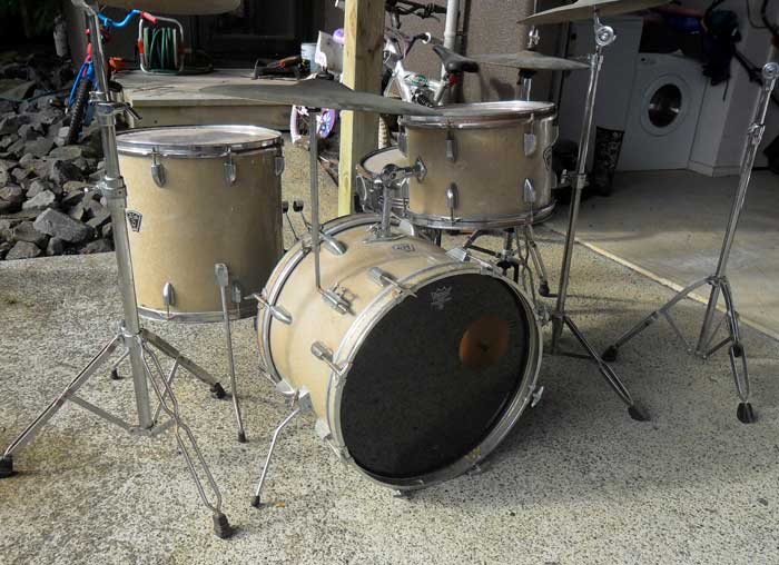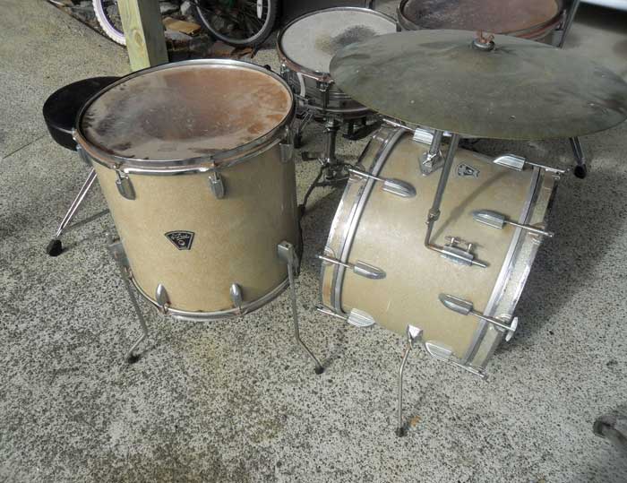Bass is 20", floor 16" and rack 13" – snare has no badge but looks of same era so maybe native to kit? Came with a bunch of stands, throne, Pacific double pedal and some not bad cymbals. A nice 20" Formula 602 ride, 18" 50's A factory sizzle which has multiple cracks and a hunk missing around center hole but still sounds great, a 14" old A hi hat and a couple of no cheaper line 14" cymbals.