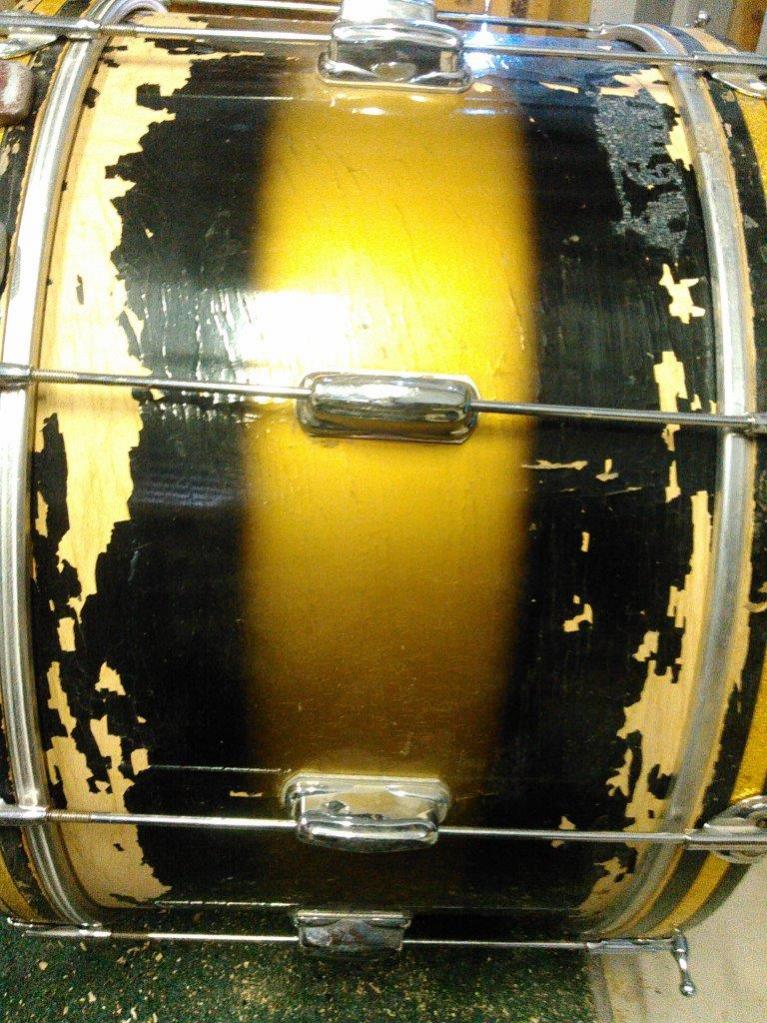 It is not all original, some of the rims have been replaced and the tom hangs off a cymbal stand. But I do not want to refinish it, it took 60 years to look this good and I am not going to mess that up. I am setting it up at my piano player's studio and he is not excited about the steady drizzle of black flakes all over his floor.