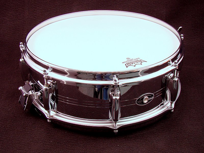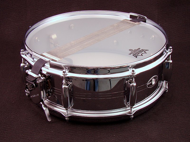 Here it is, all shiny, new Ambassador heads, new snare straps, and of course the little three eared knob I pressed on the Zoomatic shaft. It cleaned up really nicely, and it sounds sweet! Love it, love it, love it!