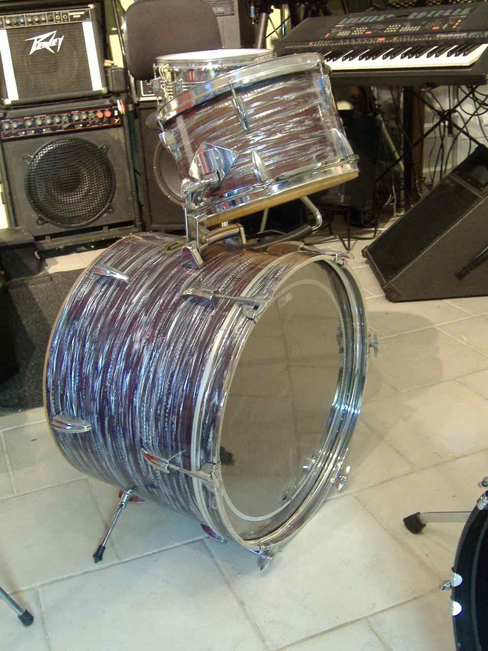 Well after testing the wife's patience with my Olympic purchase, (see: http://www.vintagedrumforum.com/showthread.php?t=35328) I happened to spot a local Kijiji ad for a MIJ bass drum, and matching rack tom. I'd have resisted the urge, especially considering it was at the other side of town, however, these particular drums appeared to be a perfect match to a floor tom I'd acquired a couple of years ago. Not one of your more common wraps either, MIJ version of oyster blue pearl I would guess) and one I particularly like, (have two Ludwig kits in this wrap). Turns out, I know the vendor, and have purchased from him before. Was able to get a good price from him, so I arranged to head straight to his place after picking up the Olympics. This is a pleasant young man who is active on Kijiji here in Ottawa, buying and selling drum gear, but is not into the vintage end. While I was there, I asked him if he had any 'hex' mount hardware, (been looking for over a year now, for early 70s, Pearl double tom mount for bass drum) and he let me rummage. Low, and behold, I find two Pearl hex tom arms. Struck up a deal for these, plus a few other drum related items and I was off.