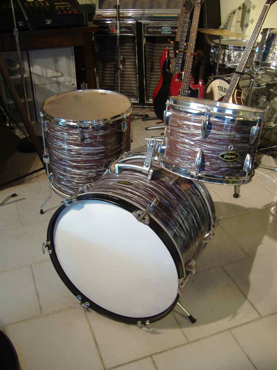 There is also a third, more extreme option: I could pull the wrap right off the shells and apply to a nicer set of shells... dunno, sounds like a lot of work. And for what I ask you? Kick, and floor tom have low lug ratio, which is a shame, though I know that I can probably get these shells sounding pretty good. In fact the Hoshino kit that I'd sold the original Univox tom with, sounded pretty good as I recall, and I'd really done nothing to those shells.