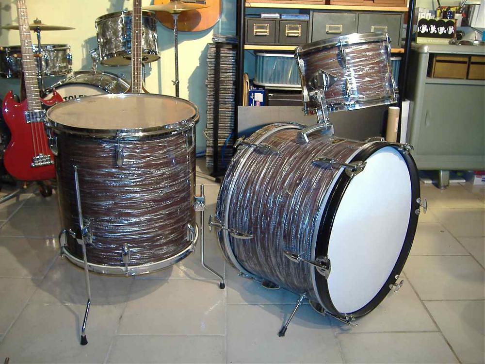 Okay, this leads me to the question; how do I have time to write this all down, and who really cares? No, that just came to me. What my dilemma really is, is, is this: Should I restore this kit as original, with original hardware, and gaudy chrome hoops, or should I upgrade it, as I did with the floor tom, with better lugs, etc.? I think the black wood hoop, (I installed that, as it only came with the one hoop) looks sharp - the inlay is 1" wide, and I could conceivably slice it in two, and split between two wood hoops... yeah, I'm gonna do THAT!