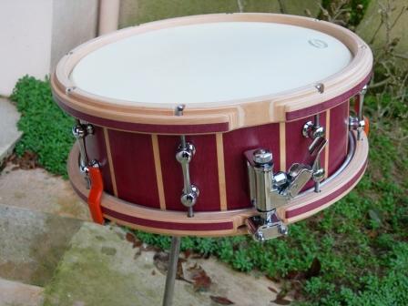 This is a purpleheart snare with maple strips I did from a 8mm stave shell built by Koko / Signature Drums: 5.5x14". Finished with shellac. Stellar maple hoops with purpleheart inlay