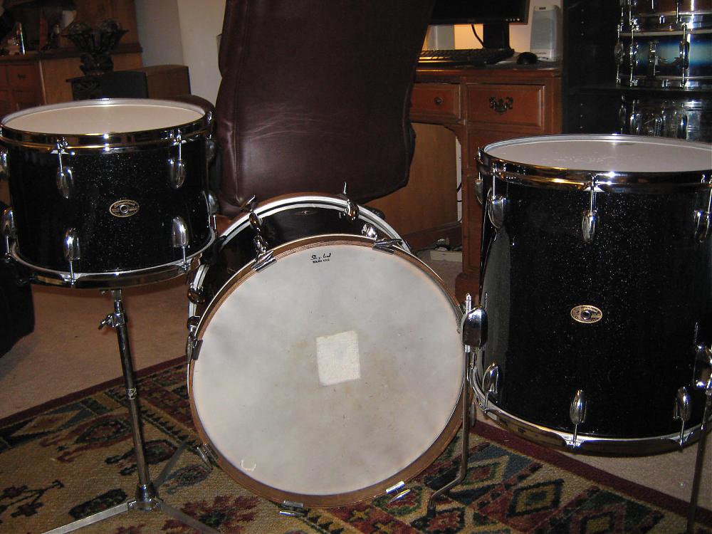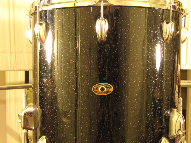 A 20/13/16 sixties Slingerland Outfit re-wrapped with a NOS custom wrap ordered by Allen Blaemire in the 70s, 80s. The only name we have for it is "Black with Gold and Silver Flecks".
