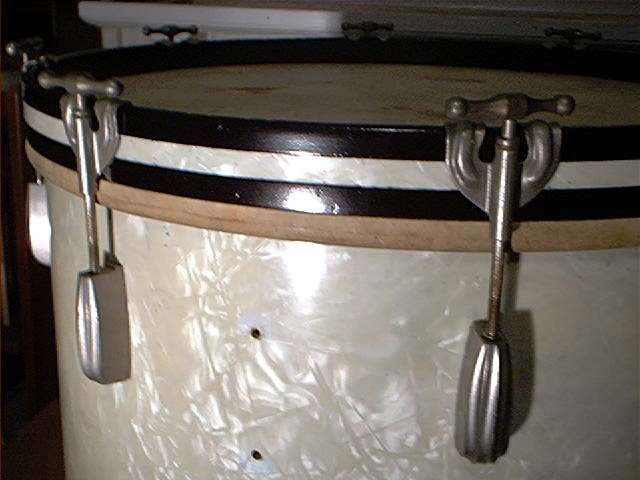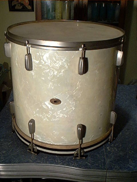 Hi. I'd like any info on this drum I have. It's an 18x20 Slingerland floor tom. It has a metal hoop on top and a wooden hoop on the bottom. It has 20 inch calf skin heads with 'Radio King' stamped on them. It also has what appears to be factory drilled holes in four places for what I believe to be tom leg mounts. These mounts are missing along with the legs. Wrap is good and tight. One lug is cracked, all the rest look good. Hardware is nickle I believe. Any info on history and value would be appreciated. Thanks.