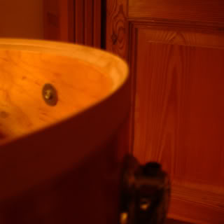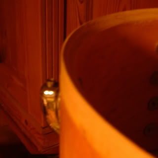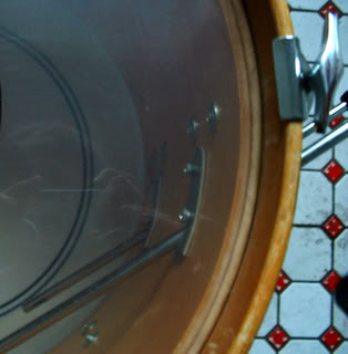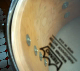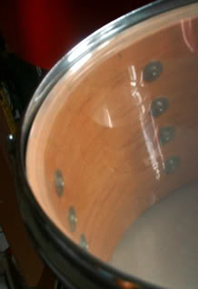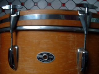 The kit has thick shells, 5 plies, in standard sizes (18x14, 12x8, 13x9, 14x14 with legs). Natural finish; when you take off a head, you see the outer ply doesn't go all way up to the edge. Bearing edges are quite sharp and cut straight (45 degree?), with hardly any countercut on the outside, quite rough (by today's standard, at least).