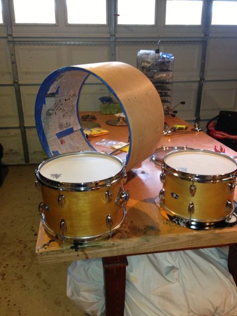 Pictures show bass drum next to 2 mounted toms I already refinished and then a close up of the hole pattern on the top of the bass drum.