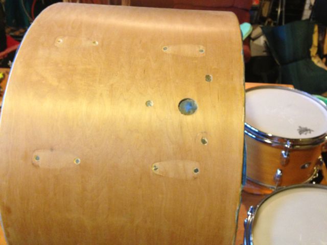 I have been working on piecing together a Slingerland natural maple kit from various orphans. Got 2 nice mounted toms all completed and recently got a 24" kick drum shell. It needed a lot of work re-gluing re rings and whatever else but I have it stripped and ready to apply the same finish I applied to the toms. I picked up a Set-O-Matic double arm and was looking to get the plate to mount to the bass drum but I realized the the hole pattern doesn't match the Set-O-Matic layout.
