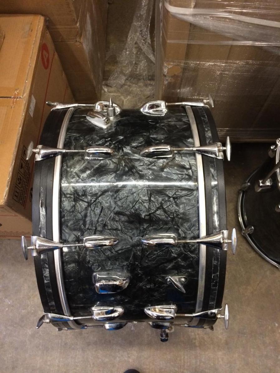 The bass drum definitely appears to be a 12x22. I cannot tell, but the rack tom seems small, like a 8x12 and the floor tom could be either a 16x16 or 14x14. I'll definitely have to wait to be sure. Does it hurt re-sale to have odd sized drums? Hypothetically, this could be a 12x22, 8x12, 14x14 (or 16x16) and 5x14. The only other 12 inch depth bass drum I saw was on a Slingerland 2N Jobbing kit that I recently sold to one of our fellow forum members.