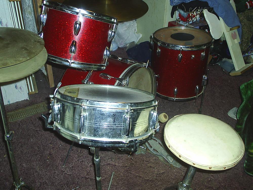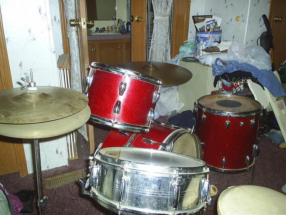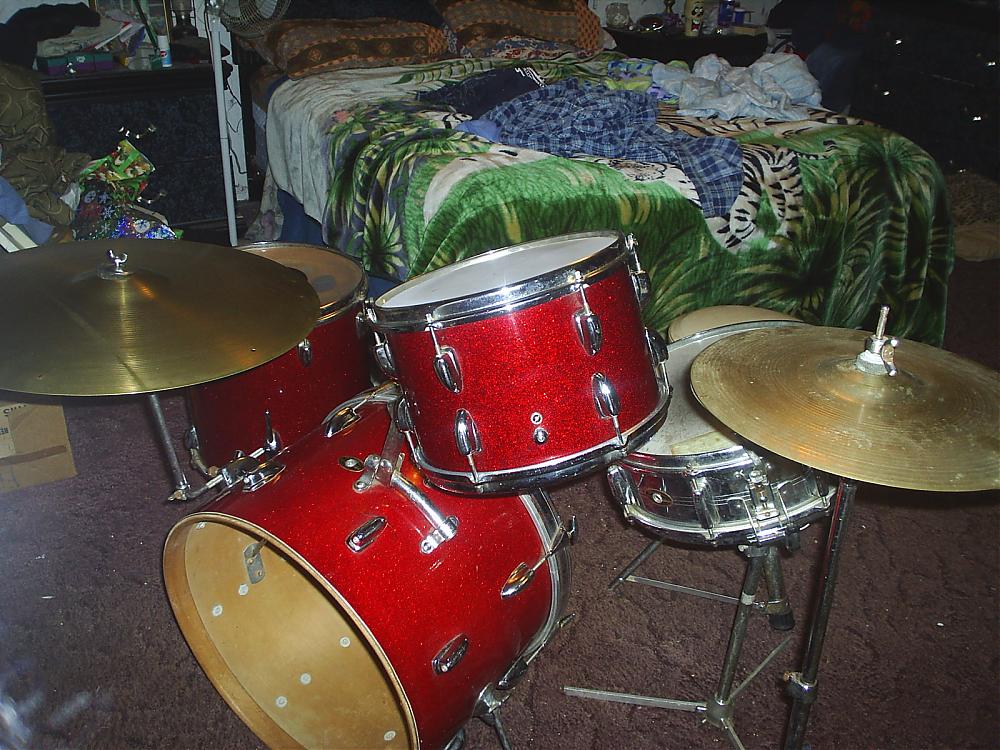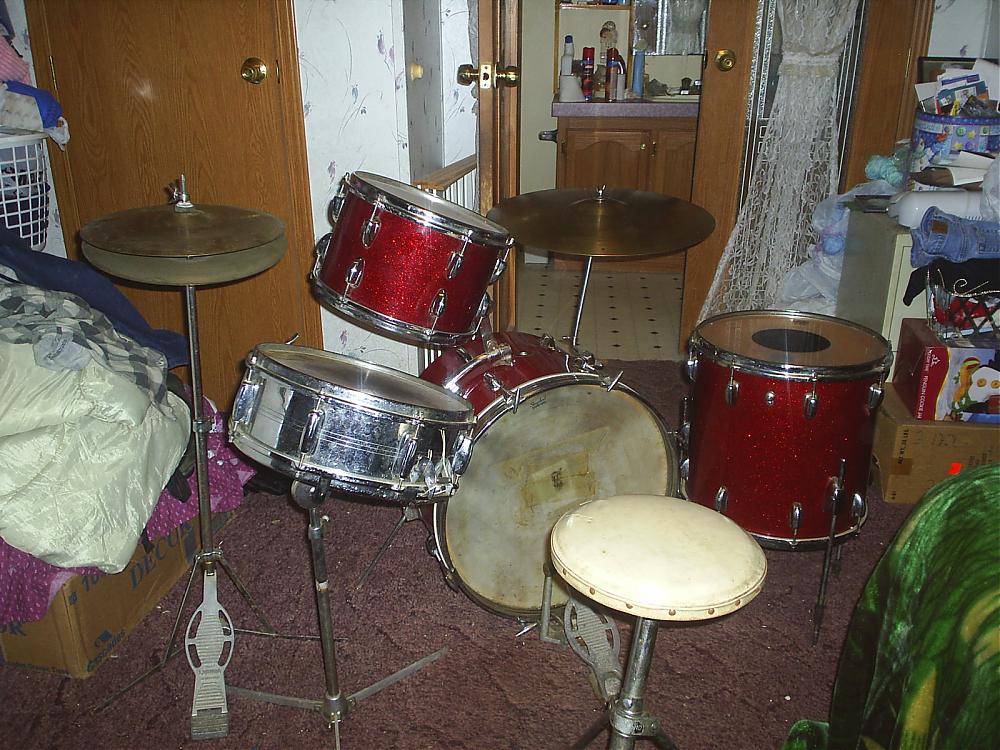 The market is a little fickle right now.. unless you can find a sucker like me who has trouble walking past a set of old drums...Well OK then.. I do love RED SPARKLE! All of the following is offered as a GUESS... others here can definately give you better estimates and details on the drums.I came up with $1,055 for everything in the picture (Drum related...);) I don't think you would get that in the market today. :(I think (not positive) the snare is special..:) That snare drum looks like a Chrome Over Brass (COB) Radio King, the drum was produced between 1963 and 1967... Interesting.. The Slingerland Book, (Rob Cook, p.190) says the lines were added around the shell in 1965.I believe that kit is the famous "Krupa Deluxe Ensemble 1-N" in beautiful red sparkle. With Slingerland throne and Ludwig Speed King pedal and Ludwig hi hat stand.The 22" bass drum.. (missing the front hoop, claws and "torpedo" tension rods) should bring around $225.. give or take $25.The small 13" mounted tom $75..$90The 16" floor tom with nice complete push button legs.. thats tough.. but you should be able to get $200 for that.Now the COB Radio King is a mystery to me.. nice COB Sound Kings can bring $200+.. so I'm thinking a COB Radio King should bring $400 (purely a guess, I hope low).$65 for the Slingerland Throne.$25 for the Speed King pedal.$50 for Ludwig Hi-Hat stand.Need more details on the cymbals.. to add them in.. any names or markings on them??