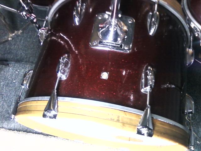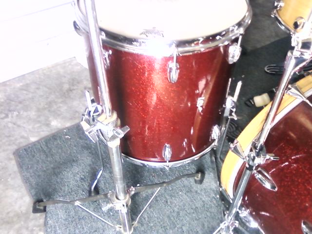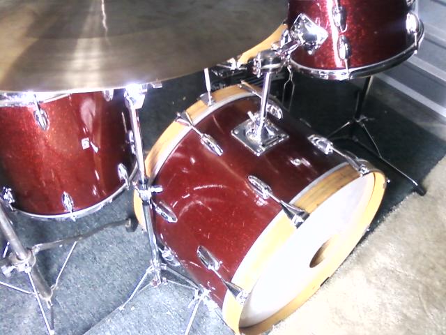 Ok, this is a early 70's Slingerland kit in a red glass glitter finish,12,16,20. These are 3ply maple shells with rings, all drums have clear maple interiors and are original. The mufflers are present as well as the set-o-matic tom arm. The seems are tight and the drums are very clean. The only issue is the black/silver badges were cut off on either side of the grommet.