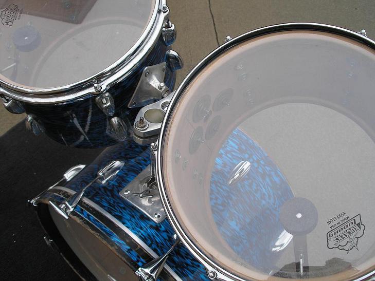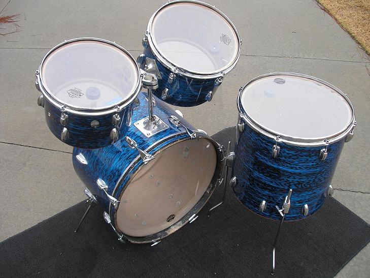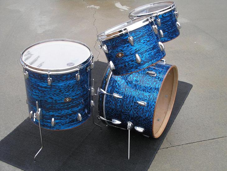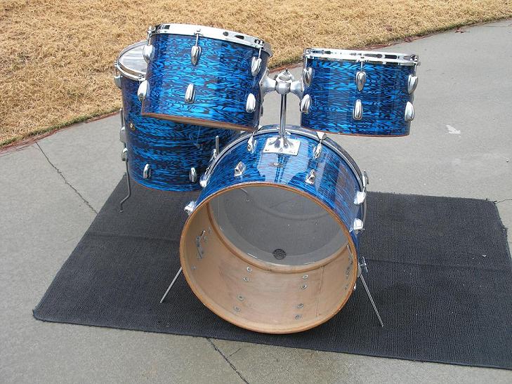 Well, checking the drum finishes under the "Vintage Drum Identification" link above would indicate this to be Blue Onyx Pearl. The Set-O-Matic tom mount was introduced in 1968.. and '68-'69 matches up with the serial# graph Dr. CJW has provided. Might be a Modern Solo kit. Torpedo handle t-rods on the bass drum.. flared legs on the floor tom.. I think that all lines up correctly.. they should be date stamped inside.