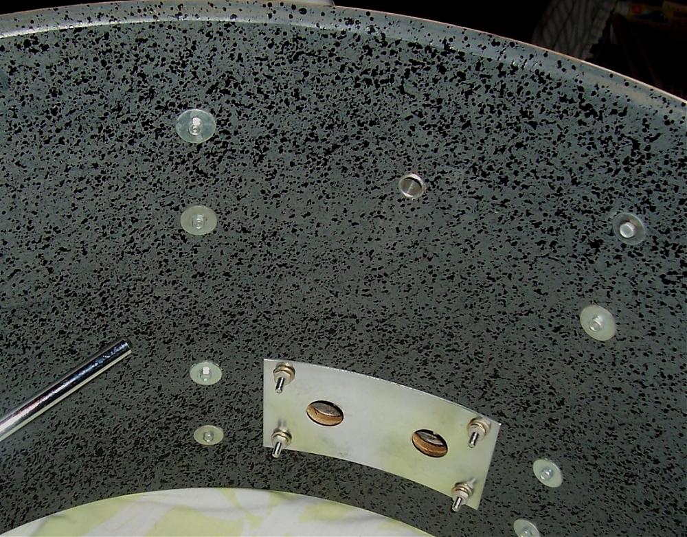 The interior shells of all of the drums are a sort of speckled black or dark grey, which I've never seen on Slingerland drums.
