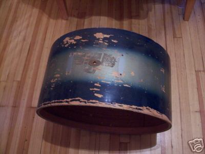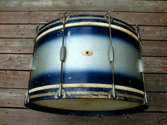 The right lugs for your drum are the No. 548 large streamlined lugs for single tension bass drums. The drum has T-rods on one side only, with the tension rod running through the lug to clasp the other hoop. This is shown in the picture below. The No. 337A shown is exactly how your drum came from the factory, except that yours looks to have the 1950 – 1953 oval, while the drum in this picture has the 1953 – 1954 oval. And your hoops were blue with silver sparkle inlay, to match the blue-silver two-tone lacquer.