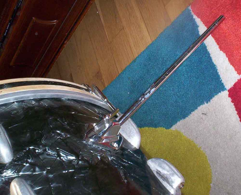2. The bass drum legs does not look like they are original. They are only fastened with two screws each, does not reach down to the floor, and are useless.