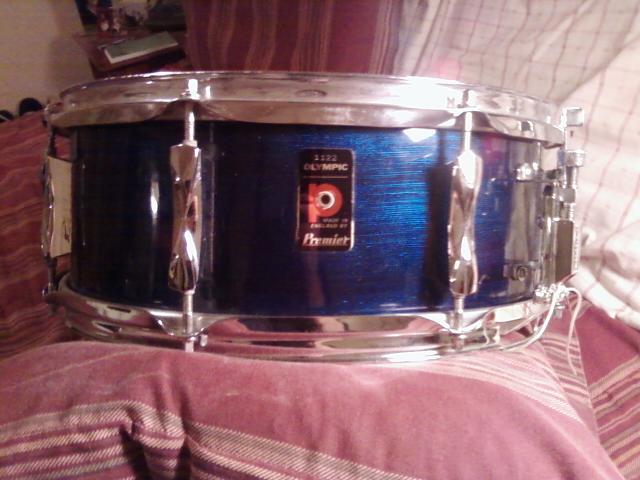 I will throw in a Premier/Olympic 5.5x14 snare in a blue shimmer finish, it's a thin birch shell with beechwood reinforcement hoops. I will also include a bran new Remo coated ambassador 20" head, with no hole or logo.