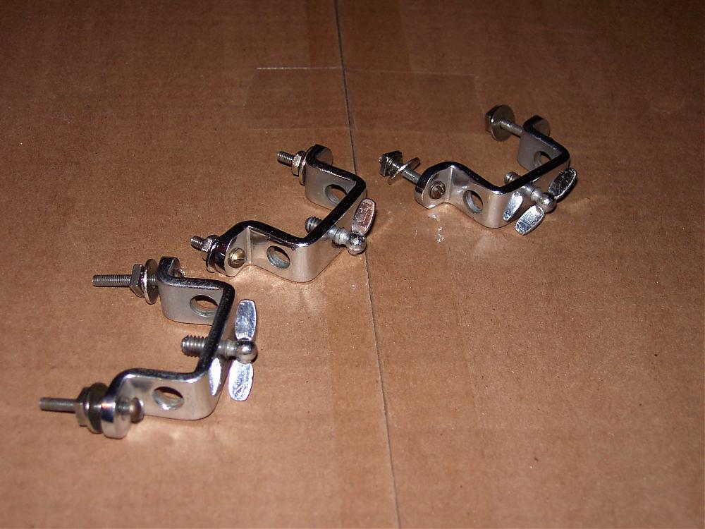 Leedy floor tom leg brackets (3) total. They are for straight floor tom legs they have chrome finish, one of the t handle has one side missing look at the pics. the hole to hole spacing is 2 1/2". $35.00. + flat rate small box shipping w/ tracking number. NOTE-- they will be listed on ebay Monday night 6/11/2012 if not sold here first.