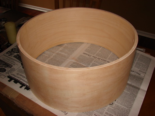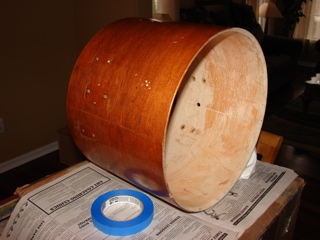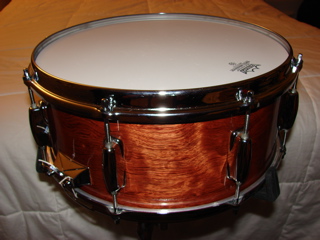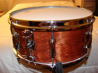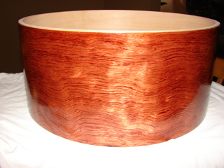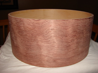 This is my first post here. My name is Bill. I've been messing with drums as a hobby for several years now. This is a recent project of mine. I bought a Ludwig Maple Classic concert tom that was in sad shape. It was poorly refinished (lousy lacquer job that was badly scratched and white latex paint inside!) This was a shell only, no hardware. I stripped it, cut it down, veneered it in bubinga, etc, etc.....